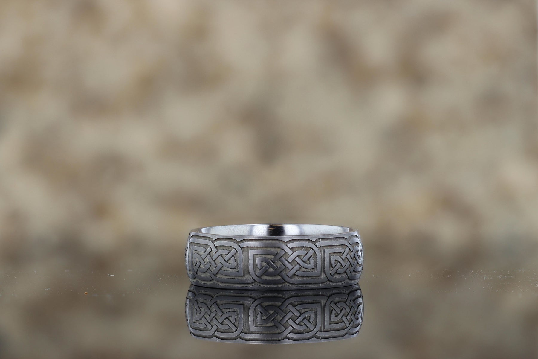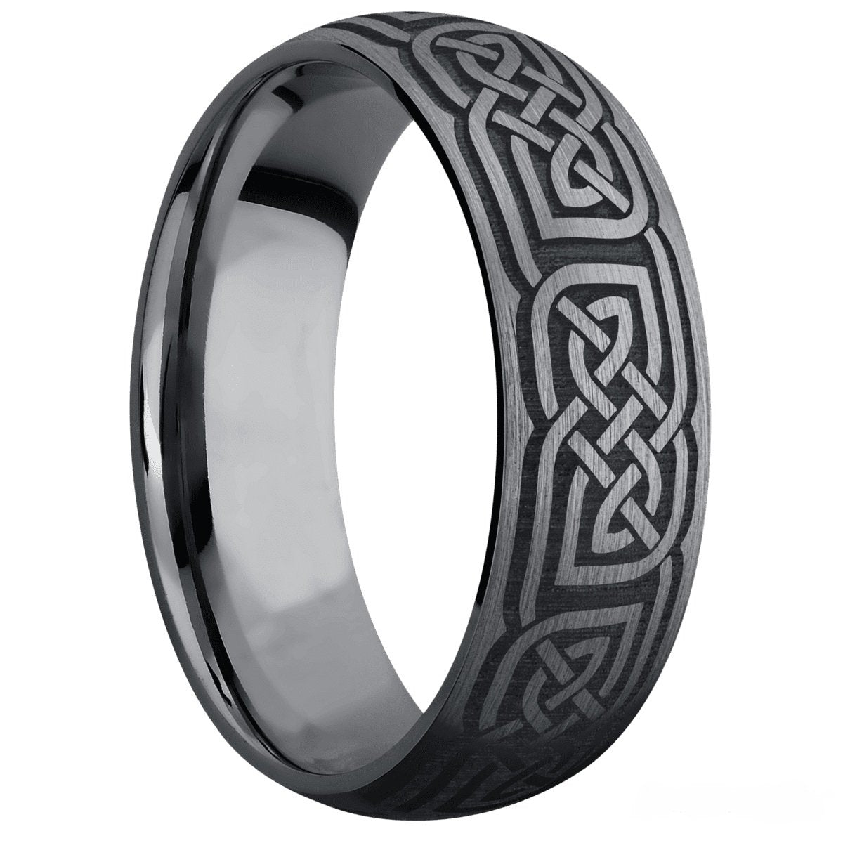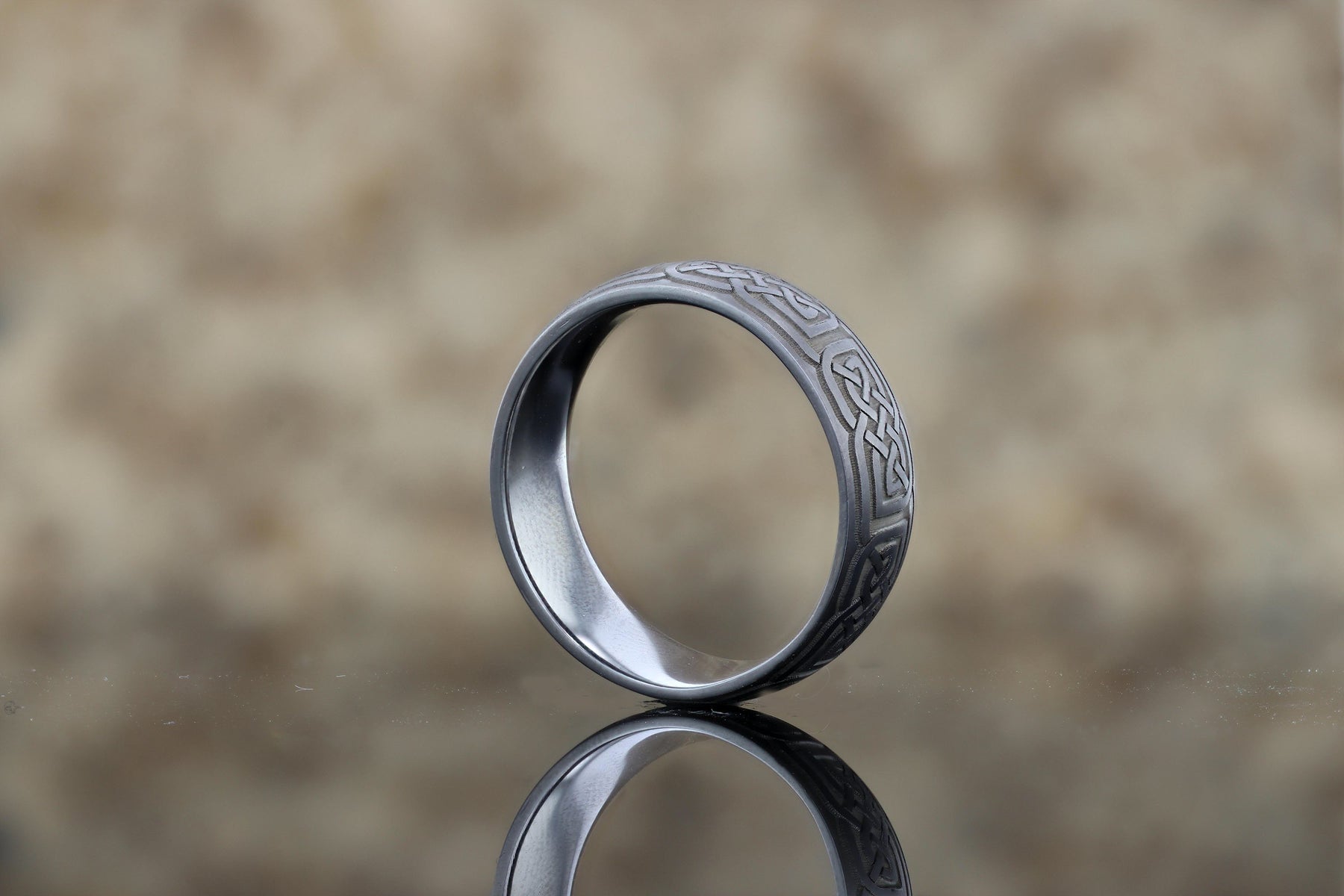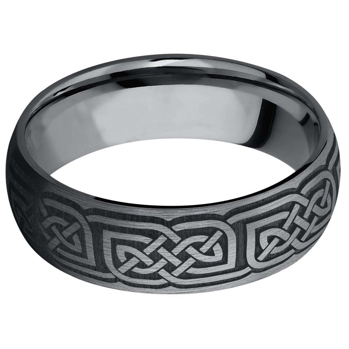 Tantalum 7mm Domed Wedding Ring with Laser Engraved Celtic Knot Design. This traditional tantalum wedding ring has a total width of 7mm wide with a domed profile. The ring is accented by a laser engraved celtic knot design and satin finish.